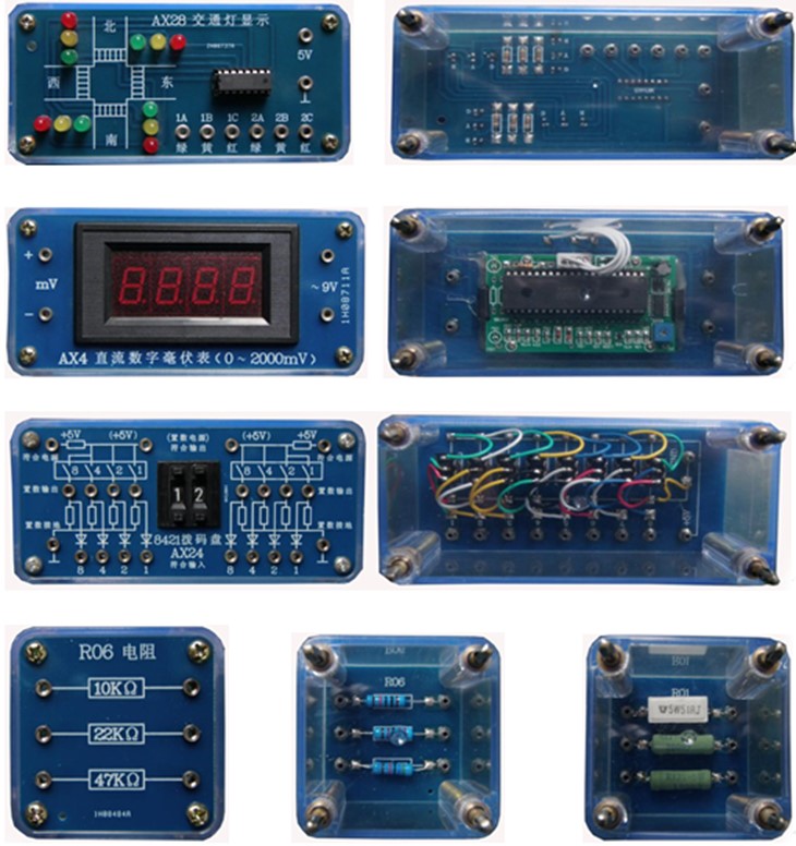 實(shí)訓模塊由透明元件盒及PCB板構成,元件盒是組合式透明元件盒,元件盒單元組采用多元件、典型實(shí)訓單元電路、典型傳感器、通用集成電路插座等制成,可根據實(shí)訓需要方便地組合成不同的電工電子實(shí)訓線(xiàn)路;使實(shí)訓具有開(kāi)放性和創(chuàng )新性,元件盒體由透明有機工程塑料注塑而成,具有示教功能,使使用者能夠觀(guān)察到元件形狀和接線(xiàn)方式,有利于教師講解和學(xué)生認識;面板采用PCB制作而成,表面清爽、符號線(xiàn)路清晰、表面耐磨損、元件更換容易;面板上標志的元件電路符號采用最新國家標準,具有整體結構緊湊、外形美觀(guān)大方、安裝簡(jiǎn)單、使用保管方便等特點(diǎn)。導線(xiàn)插孔采用防轉座,導線(xiàn)裝有彈性插頭可在模塊上面插接,以保證可靠連接進(jìn)行各種實(shí)訓;實(shí)訓時(shí)可根據實(shí)訓內容和技能訓練的需要,方便的任意組合實(shí)訓線(xiàn)路,以完成不同的實(shí)訓項目等。