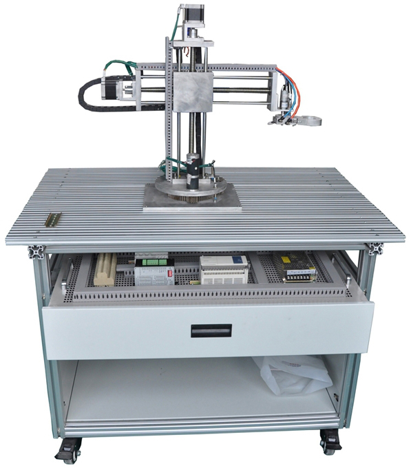 十字滑實(shí)訓裝置為實(shí)際自動(dòng)倉儲系統的微縮,使用可編程控制器控制,在X、Y、Z軸三個(gè)方向上準確地驅動(dòng)步進(jìn)電動(dòng)機進(jìn)行物品搬運、移動(dòng)的成品,完善的執行機構可實(shí)現現代物流系統中全部動(dòng)作過(guò)程。十字滑實(shí)訓裝置由鋁合金導軌式實(shí)訓臺、機械手裝置、控制系統等組成。實(shí)訓裝置為坐標式機械手,可完成機械手旋轉、手臂垂直上下、手臂水平移動(dòng),手爪旋轉四個(gè)自由度的位置精確控制。同時(shí)配置晶體管式PLC可編程控制器,用于對整個(gè)機械手進(jìn)行復雜地位置控制。該實(shí)訓裝置的控制部分均采用標準式模塊設計,可分為電源模塊、PLC模塊、系統控制模塊。包含了機電一體化專(zhuān)業(yè)中所涉及的諸如步進(jìn)電機驅動(dòng)、機械傳動(dòng)、氣動(dòng)、可編程控制器、傳感器、等多項技術(shù),給學(xué)生提供了一個(gè)綜合實(shí)訓環(huán)境,使學(xué)生學(xué)過(guò)的諸多單科專(zhuān)業(yè)知識在這里得到全面認識、綜合訓練和相互提升。