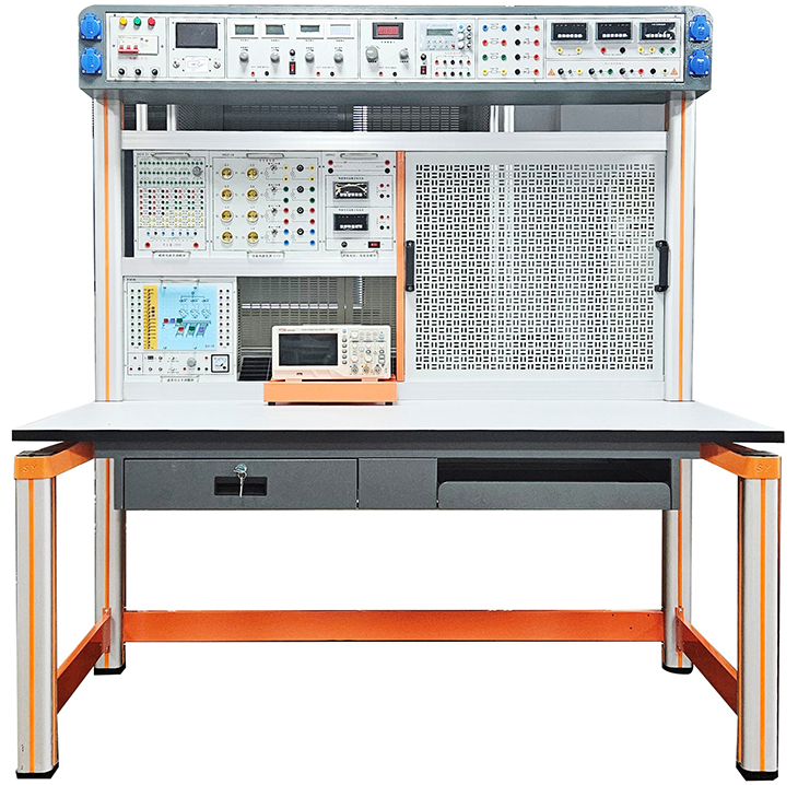 實(shí)驗桌后面二支桌腳向上延伸,配上特制拉模成型的帶滑槽橫梁鋁型材組成實(shí)訓屏,實(shí)訓時(shí)左邊放置電氣實(shí)訓掛箱(2層)及示波器支架,右邊裝置網(wǎng)孔板等,實(shí)訓掛箱、網(wǎng)孔板在實(shí)訓屏上實(shí)訓時(shí)上下方便,左右移位自如。實(shí)訓屏頂部安裝主機箱,實(shí)訓屏底部安裝實(shí)驗儀器工作電源箱。