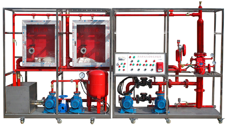 消防給水和消火栓演示系統,模型框架和水箱等主要部件全部使用不銹鋼器件,保證不生銹、不易老化,模擬兩層大樓噴淋滅火系統;模型系統主要由噴淋水泵、氣壓罐、濕式報警閥、水力警鈴、延時(shí)器、壓力開(kāi)關(guān)、水流指示器、封閉式噴頭、試驗閥、火災探測器、火災報警器等典型噴水滅火設備構成,能生動(dòng)模擬大樓內水滅火系統的典型結構。