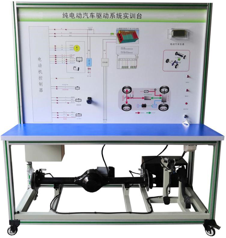 檢測控制面板(裝有各種檢測端子,1448×940mm彩色電路圖和工作原理示意圖)、組合儀表、點(diǎn)火開(kāi)關(guān)、電機控制器、車(chē)載充電器與充電接口、DC-DC轉換器、鋰動(dòng)力電池組、電動(dòng)車(chē)電機(直流無(wú)刷電機)與變速箱、后輪左右液壓制動(dòng)裝置、驅動(dòng)橋傳動(dòng)裝置、剎車(chē)開(kāi)關(guān)、檔位開(kāi)關(guān)、油門(mén)控制裝置、大電流繼電器、電源總開(kāi)關(guān)、急停開(kāi)關(guān)、輔助蓄電池(12V45AH)、一體化全鋁合金型材搭建的移動(dòng)臺架(1500×700×1700mm (帶自鎖腳輪裝置,帶安裝檢測端子的原理面板,面板1448×940mm)、故障考核系統、設備操作說(shuō)明書(shū)。
