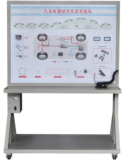 該設備由啟動(dòng)開(kāi)關(guān)、油門(mén)踏板、擋位開(kāi)關(guān)、制動(dòng)開(kāi)關(guān)、數字轉速表、電流指示表等,并輔以發(fā)光二極管進(jìn)行系統流向的動(dòng)態(tài)指示,加速度傳感器、12V開(kāi)關(guān)電源、大型彩色噴繪電路原理圖、控制面板、可移動(dòng)臺架、使用操作手冊等。