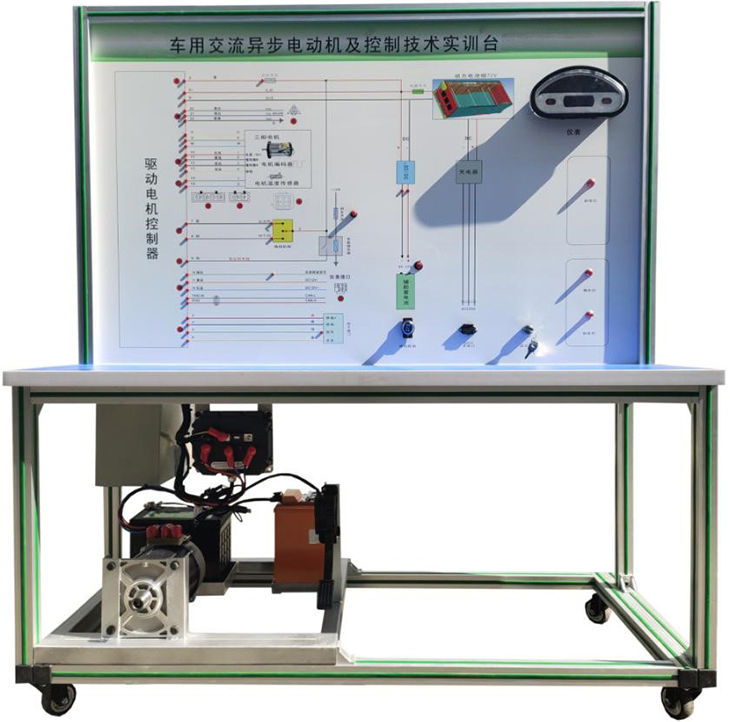 檢測控制面板(裝有各種檢測端子,1448×940mm彩色電路圖和工作原理示意圖)、組合儀表、點(diǎn)火開(kāi)關(guān)、電機控制器、車(chē)載充電器與充電接口、DC-DC轉換器、鋰動(dòng)力電池組、電動(dòng)車(chē)電機(交流異步電動(dòng)機)、剎車(chē)開(kāi)關(guān)、檔位開(kāi)關(guān)、油門(mén)控制裝置、大電流繼電器、電源總開(kāi)關(guān)、急停開(kāi)關(guān)、輔助蓄電池(12V45AH)、一體化全鋁合金型材搭建的移動(dòng)臺架(1500×700×1700mm (帶自鎖腳輪裝置,帶安裝檢測端子的原理面板,面板1448×940mm)、設備操作說(shuō)明書(shū)。
