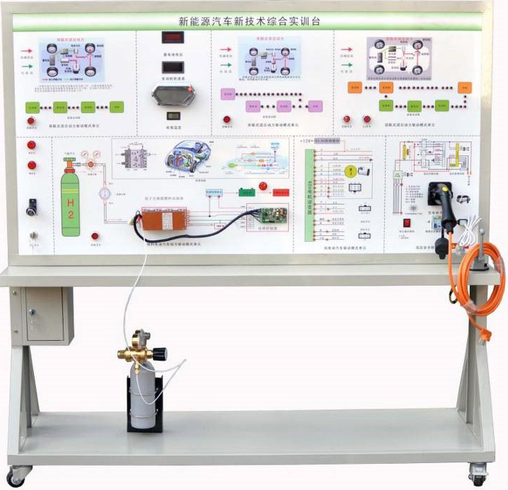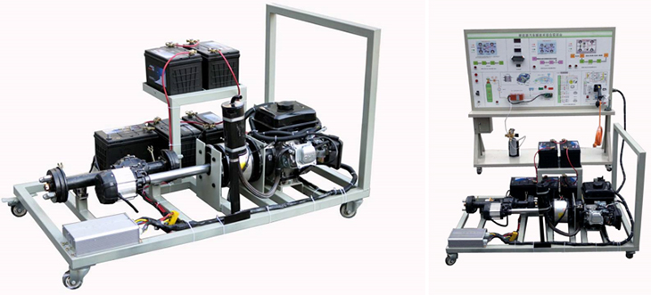 發(fā)電機、發(fā)動(dòng)機、燃料電池及運行附件、電池組、逆變器、三相交流電機、傳動(dòng)機構、制動(dòng)機構、故障模擬與考核裝置、檢測面板與可移動(dòng)臺架等組成。