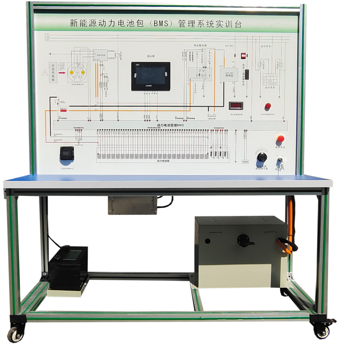 檢測控制面板(裝有各種檢測端子,1448×940mm彩色電路圖和工作原理示意圖)、組合儀表、點(diǎn)火開(kāi)關(guān)、電機控制器、車(chē)載充電器與充電接口、DC-DC轉換器、鋰動(dòng)力電池組、電動(dòng)車(chē)電機(交流異步電動(dòng)機)、剎車(chē)開(kāi)關(guān)、檔位開(kāi)關(guān)、油門(mén)控制裝置、大電流繼電器、電源總開(kāi)關(guān)、急停開(kāi)關(guān)、輔助蓄電池(12V45AH)、一體化全鋁合金型材搭建的移動(dòng)臺架(1500×700×1700mm (帶自鎖腳輪裝置,帶安裝檢測端子的原理面板,面板1448×940mm)、設備操作說(shuō)明書(shū)。