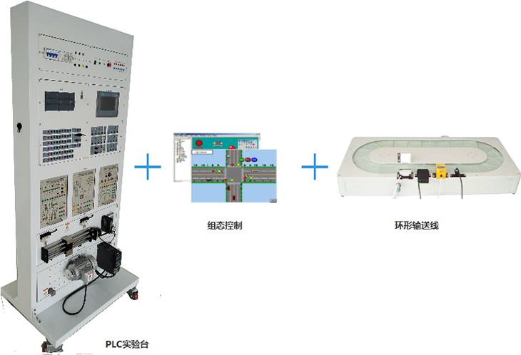 開(kāi)放式多功能PLC教學(xué)實(shí)驗系統由PLC工作臺、組態(tài)軟件、環(huán)形輸送線(xiàn)以及遠程控制實(shí)驗系統等部分組成(如下圖所示)。其中PLC工作臺集成了PLC控制、電源管理、觸摸屏人機交互單元、變頻驅動(dòng)單元、步進(jìn)驅動(dòng)單元等幾部分功能模塊。環(huán)形輸送線(xiàn)是根據實(shí)際生產(chǎn)線(xiàn)中的一段為原型簡(jiǎn)化而成,是一個(gè)典型的物品識別與分揀系統,配有紅外傳感器、電渦流傳感器、霍爾傳感器等與可完成速度測量、產(chǎn)品計數、磁性物品識別等實(shí)驗等。