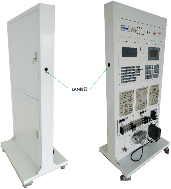 該教學(xué)實(shí)驗系統支持以太網(wǎng)連接,PLC可編程控制器、HMI觸摸屏和交流變頻器均通過(guò)PROFINET基于以太網(wǎng)進(jìn)行通信;PLC工作臺之間可通過(guò)臺體左右兩側的LAN接口(PN口)進(jìn)行級聯(lián),構建由多臺組成的PLC控制網(wǎng)絡(luò ),從而實(shí)現網(wǎng)絡(luò )化實(shí)驗教學(xué)。