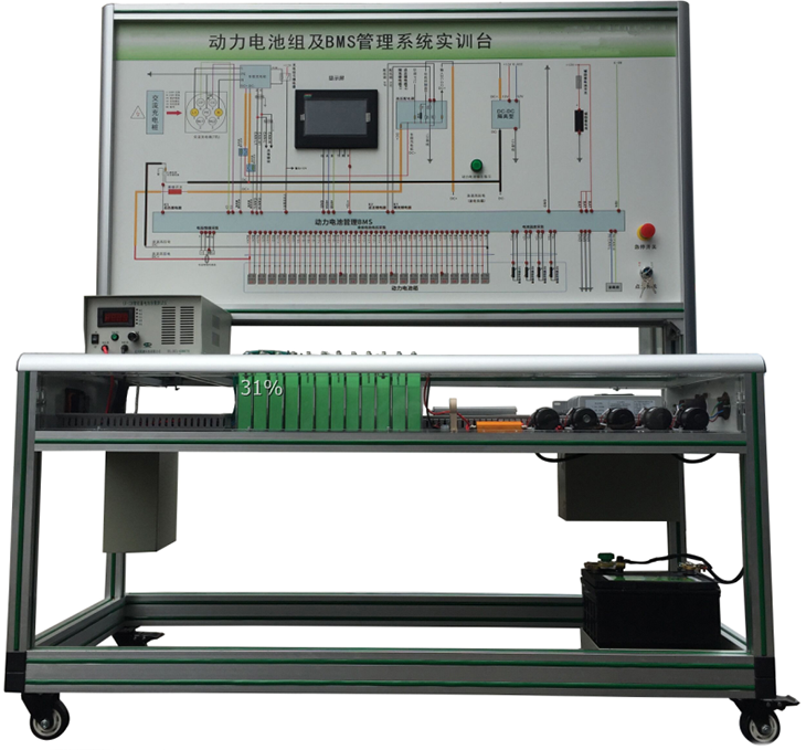 磷酸鐵鋰動(dòng)力電池包與鐵制電池箱(單體電池3.2V 20AH,24串)、BMS鋰電管理一體機、動(dòng)力電池包觸摸顯示屏、車(chē)載充電機、國標充電插口、國標充電槍、緊急斷電開(kāi)關(guān)、霍爾電流傳感器、直流接觸器(包含充電繼電器、總正繼電器、總負繼電器、預充繼電器)、DC-DC轉換器(72V-12V30A)、輔助蓄電池(12V45AH)、放電控制繼電器與放電負載電阻、預充電阻器、可移動(dòng)實(shí)訓臺(1500×700×1700mm 帶自鎖腳輪裝置,帶安裝檢測端子的原理面板,面板1448×940mm)、故障模擬與排除裝置、設備操作說(shuō)明書(shū)。