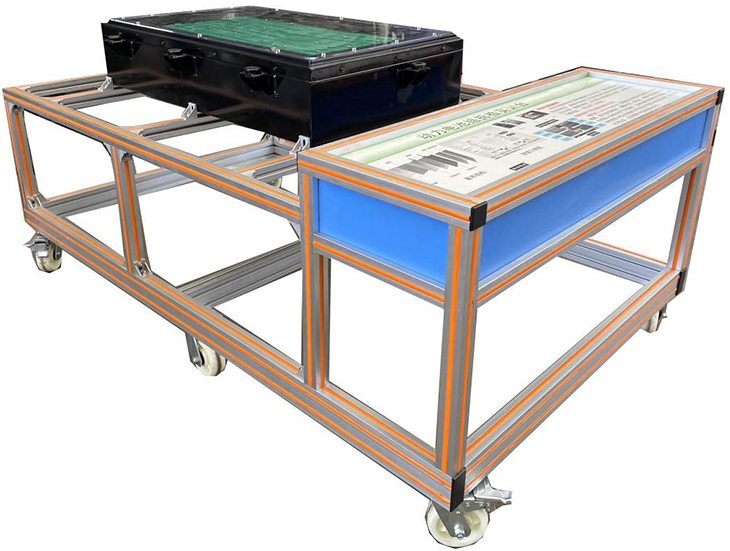 動(dòng)力電池包及BMS總成、緊急斷電開(kāi)關(guān)、維修開(kāi)關(guān)、霍爾電流傳感器,直流接觸器(包含充電繼電器、總正繼電器、總負繼電器、預充繼電器),單體電池充電器,一體化全鋁合金型材搭建的移動(dòng)臺架(1880×1160×1300mm 帶自鎖腳輪裝置)、設備操作說(shuō)明書(shū)。
