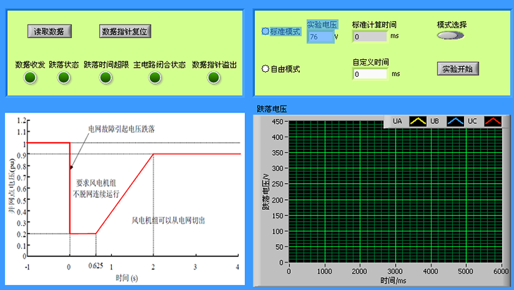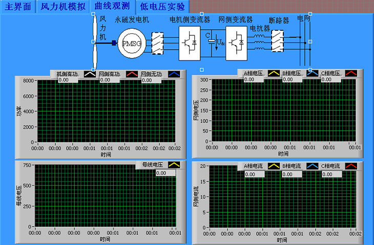 FaceView實(shí)驗主控軟件具有風(fēng)速特性模擬和風(fēng)機主控功能,能模擬幾種典型風(fēng)速如:微風(fēng)、陣風(fēng)、持續大風(fēng)、持續中速風(fēng)、或四種風(fēng)速合成特性。主控和風(fēng)機模擬的參數修改權限向用戶(hù)開(kāi)放,用戶(hù)可以自由定制風(fēng)力機特性,選配接收實(shí)際的測風(fēng)儀數據。主控功能實(shí)現機組并網(wǎng)控制,恒速運行,限功率運行,降功率運行,低電壓穿越,機組脫網(wǎng)控制。