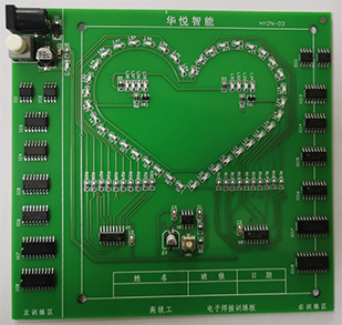 初級功能訓練板:主要是滿(mǎn)足插件元器件焊接的教學(xué)訓練。教學(xué)生認識插件電阻、插件二極管、插件無(wú)極性電容、電解電容圖標以及插件芯片等焊接。電阻選用1/8W,1/4W兩種常規格的設計焊盤(pán),并設計較疏、一般、較密三種焊盤(pán)間距。LED焊接采用3和?5兩種腳距形成'OK'字樣。初級功能訓練板焊接主要教會(huì )學(xué)生直插元器件認知、元器件整形、插件、焊接等技能。也可以教學(xué)生學(xué)習電阻色環(huán)標識。