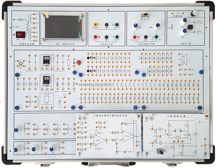 創(chuàng )新型模塊化模擬電路實(shí)驗箱由全鋁合金箱體、高性能線(xiàn)性電源和實(shí)驗電路板組成。其中實(shí)驗電路既可以采用固定功能模塊方式,也可以自行搭建實(shí)驗電路,電路原理和元器件符號清晰,實(shí)驗用元器件全部焊裝在線(xiàn)路板的反面,安全可靠,不易損壞。本實(shí)驗箱適用于本專(zhuān)院校所有電類(lèi)和非電類(lèi)專(zhuān)業(yè)《模擬電子技術(shù)》、《電子線(xiàn)路》等課程的實(shí)驗教學(xué)。