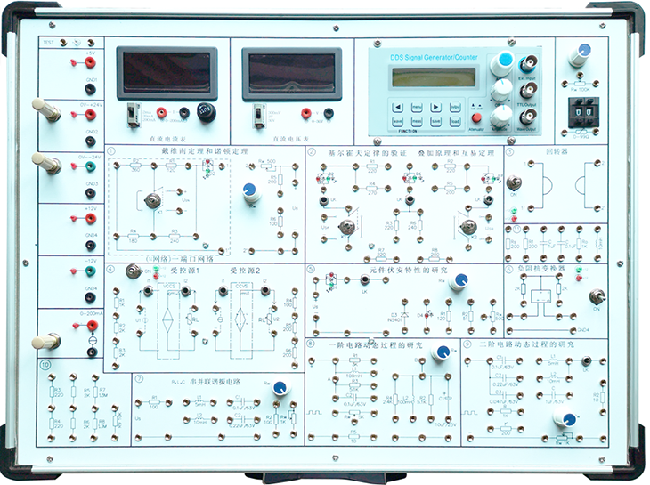 由鋁木合金材料制作箱體,無(wú)任何污染源。箱體內含直流穩壓電源、函數信號發(fā)生器、實(shí)驗用恒流源和恒壓源、測量用直流電流表、直流電壓表、導線(xiàn)測試電路和實(shí)驗電路模塊等組成。
