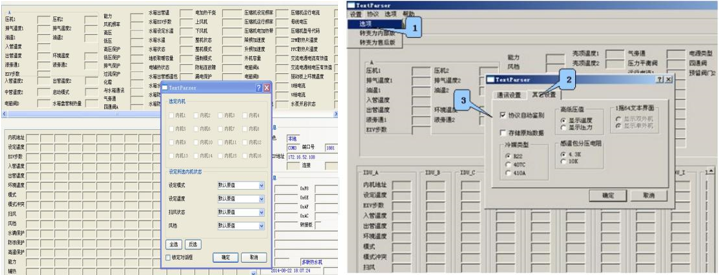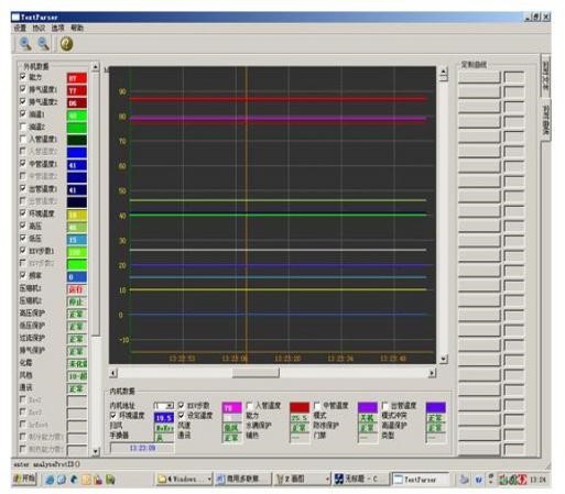 文本顯示界面:可測試壓縮機的運轉頻率,傳感器的各種數據,電子膨脹閥的工作步數等幾十種中央空調的工作數據和狀態(tài),