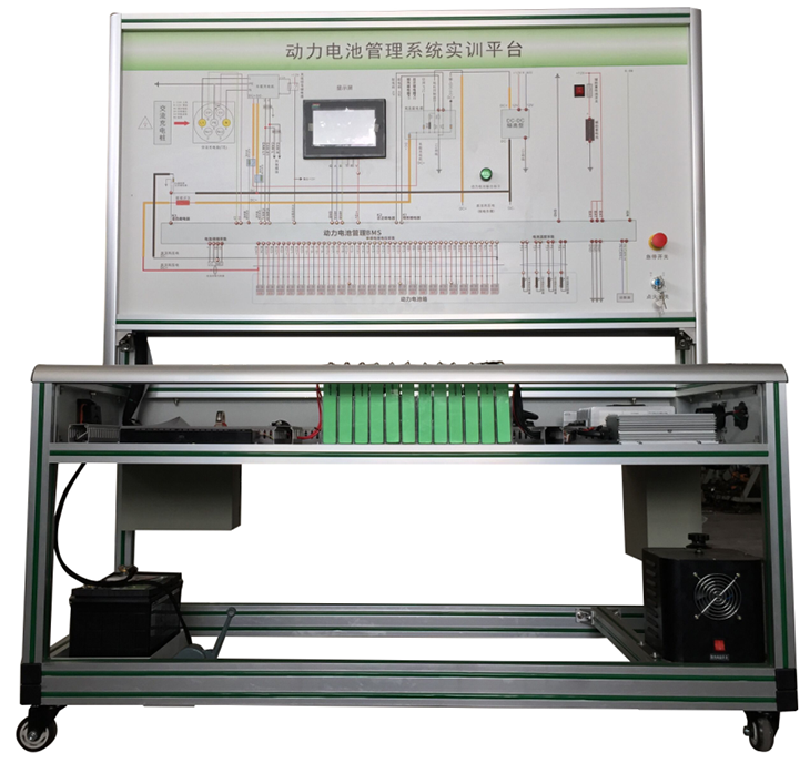 磷酸鐵鋰動(dòng)力電池包,BMS鋰電管理一體機,動(dòng)力電池包觸摸顯示屏,充電機,國標充電插口,國標充電槍?zhuān)o急斷電開(kāi)關(guān),霍爾電流傳感器,直流接觸器,DC-DC轉換器,輔助蓄電池,放電控制繼電器與放電負載,電阻,可移動(dòng)實(shí)訓臺(帶檢測端子的原理面板)。