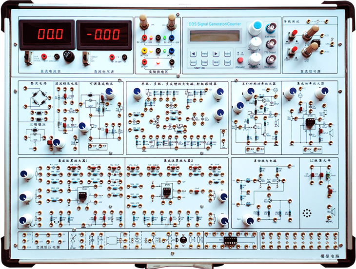 含機箱、工作電源、常用模擬信號源、實(shí)驗電路區和分立元件 |