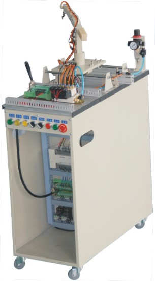 由機械手、橫臂、回轉臺、旋轉氣缸、開(kāi)關(guān)電源、可編程序控制器、按鈕、I/O接口板、通訊接口板、電氣網(wǎng)孔板、多種類(lèi)型電磁閥及氣缸組成,主要完成將工件從上站搬至下一站。