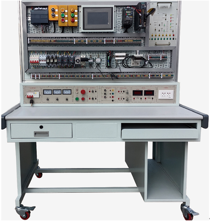 自動(dòng)化控制技能實(shí)訓臺主要用于訓練員工的自動(dòng)化應用綜合能力,訓練內容包含:PLC通訊技術(shù)、PLC編程、觸摸屏應用、變頻器控制技術(shù)、伺服控制技術(shù)等。實(shí)訓臺底部裝有帶剎車(chē)的腳輪,方便移動(dòng)和固定。電氣元器件的布置應合理美觀(guān),并預留有一定空間,以便后期擴展其他培訓內容。