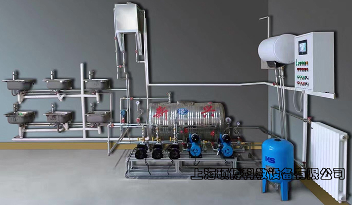 1、生活給水系統:主要有給水箱、給水泵、給水管道、壓力變送器、脈沖水表、水龍頭和淋浴頭等組成。管路采用不銹鋼復合管進(jìn)行設計,可進(jìn)行不銹鋼復合管的切割、安裝和通水試驗操作,通過(guò)控制系統可實(shí)現生活給水系統的變頻恒壓供水功能,實(shí)現單泵變頻控制或雙泵切換控制等功能;通過(guò)脈沖式水表可以完成用水量的計量。